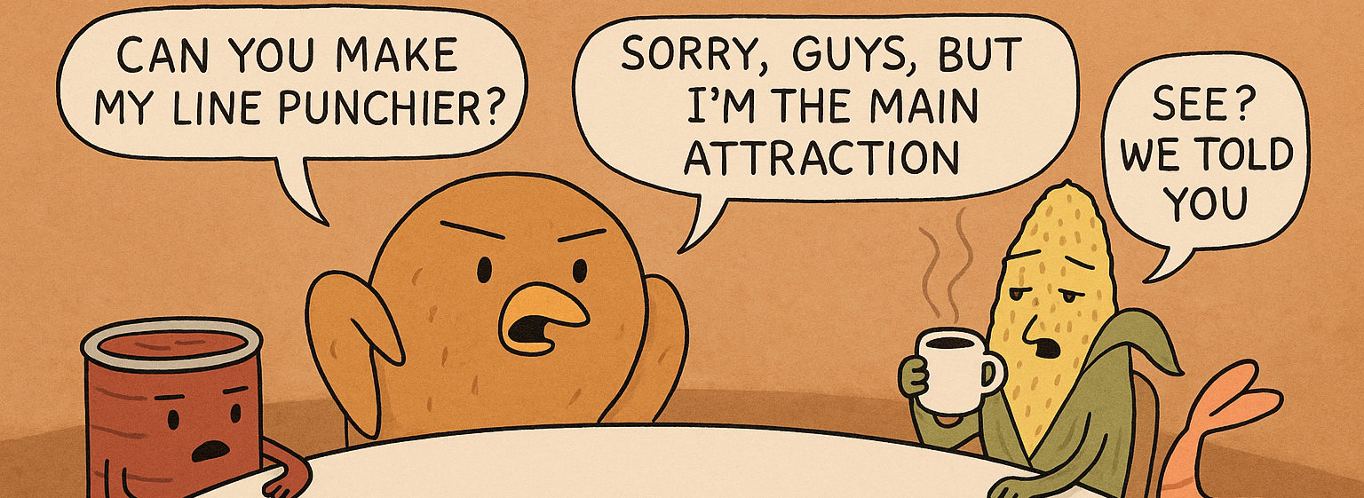 I knew I was in trouble when the cranberry sauce started giving creative feedback at the table. “Can you make my line punchier but more customer-centric? Some people like me in the can, but I can also be homema—”